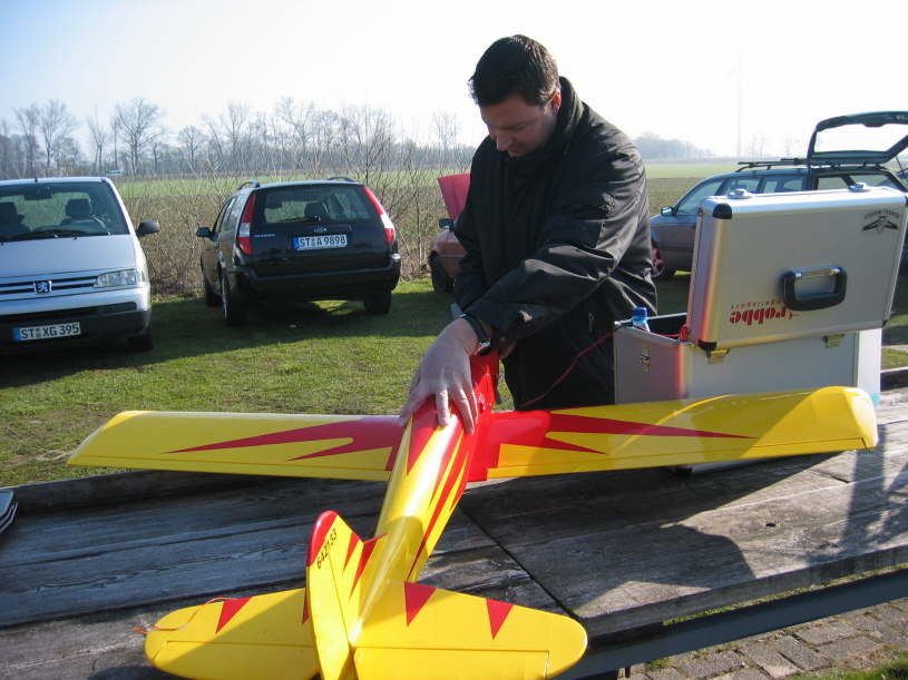 Amir mit neuem Flächenflieger... und nörgelt darüber, dass man bei einem Flächenflieger im Gegensatz zum Hubi nur am Schrauben, Kleben und Einstellen ist.