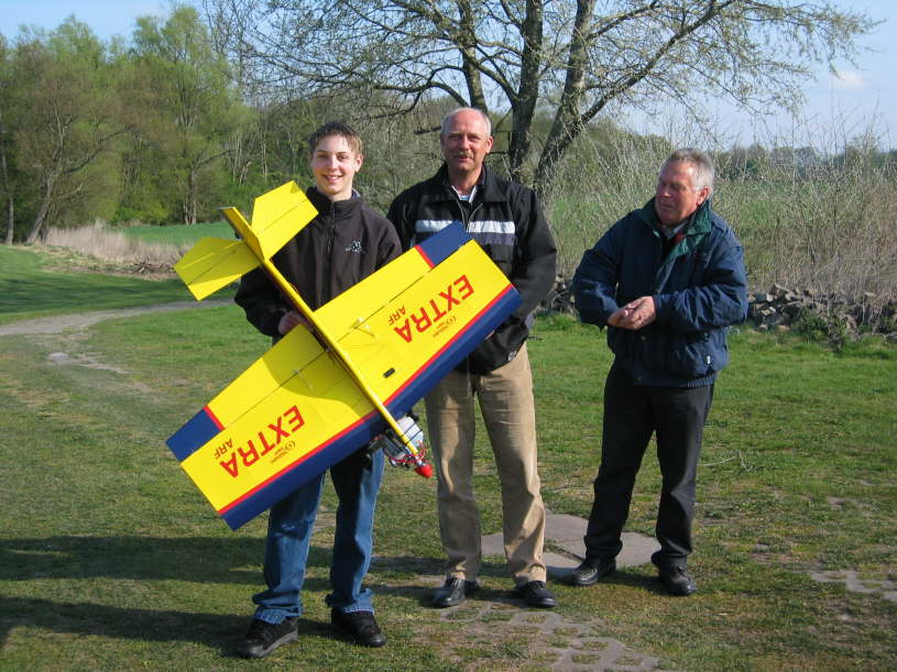 Eeeeendlich: Es ist geschafft... Vater, Sohn und Lehrer freuen sich über der erfolgreichen Erstflug mit dem neuen (na ja) Fun Flyer.