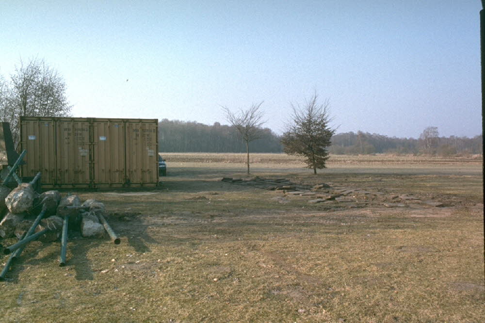 Die traurigen Reste unserer abgebrannten 2. Hütte im Vordergrund und hinten die neuen Stahlcontainer (einbruchsicher, schwer entflammbar und transportabel)